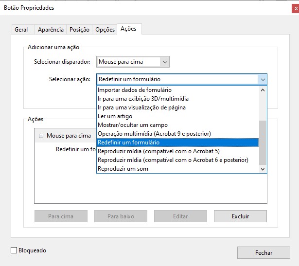 Podemos criar um botão de ação para nesse caso por exemplo limpar todas as respostas do formulário, para isso basta usar a opção “OK”, e selecionar o tipo de ação do botão na janela propriedades, na aba “ações”:
