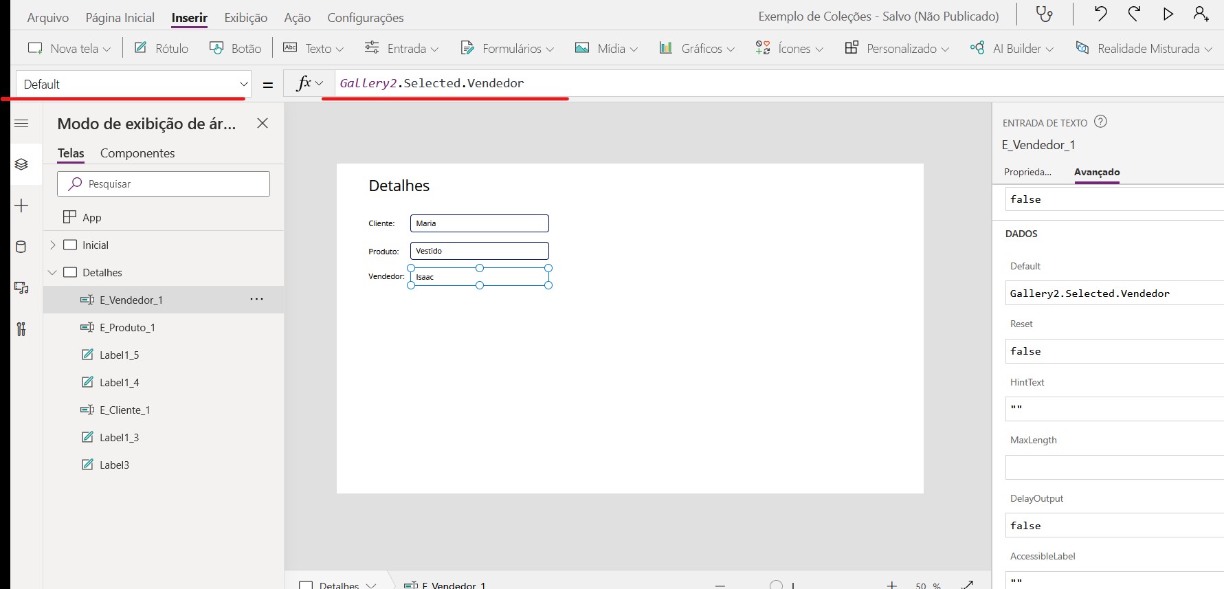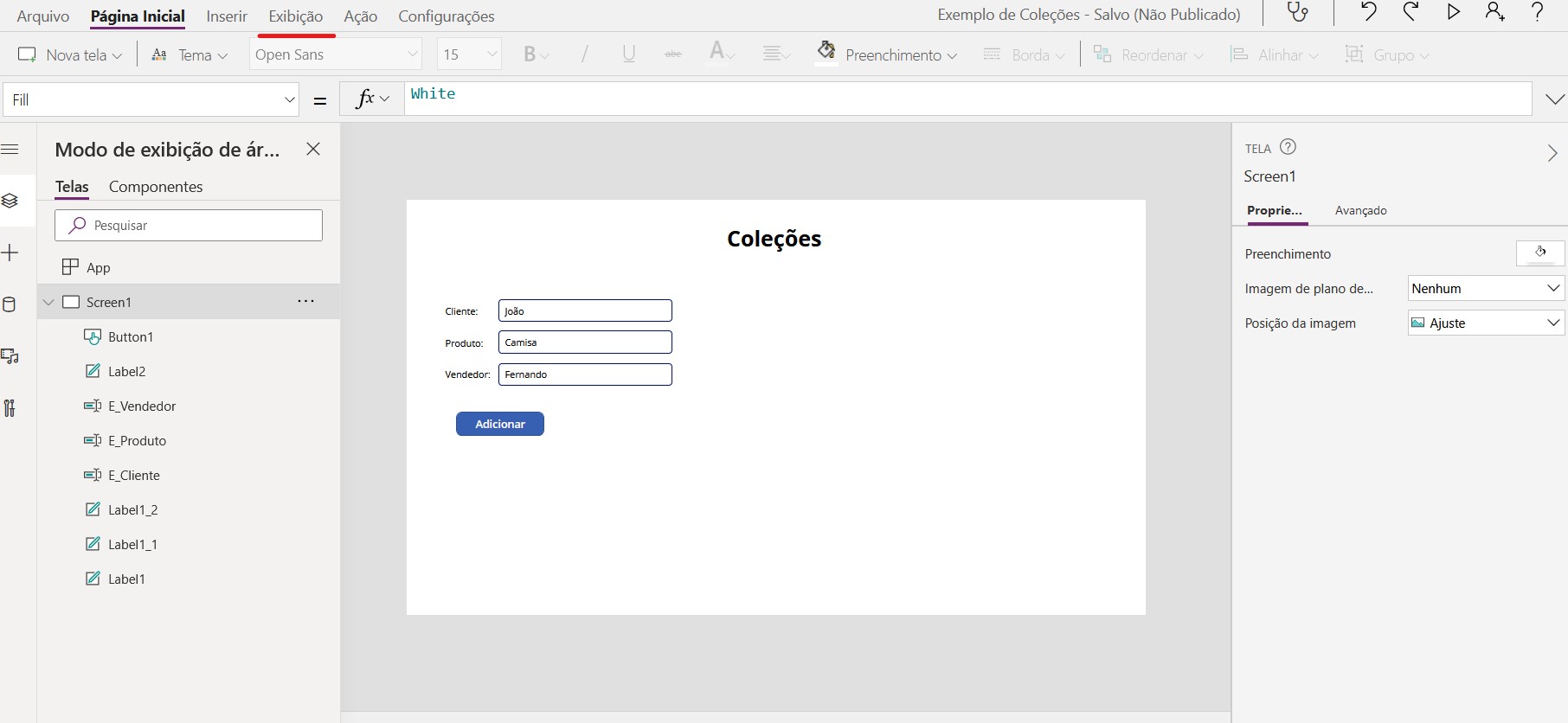 Iremos fazer com que esse botão adicione os dados preenchidos nas entradas de texto em uma coleção. Para isso precisamos usa a função “Collect” no campo de “OnSelect” do botão e nomear a coleção assim como a maneira em que iremos adicionar os dados, a função completa fica dessa forma: Collect(InfoVenda; {Cliente: E_Cliente.Text; Produto: E_Produto.Text; Vendedor: E_Vendedor.Text})