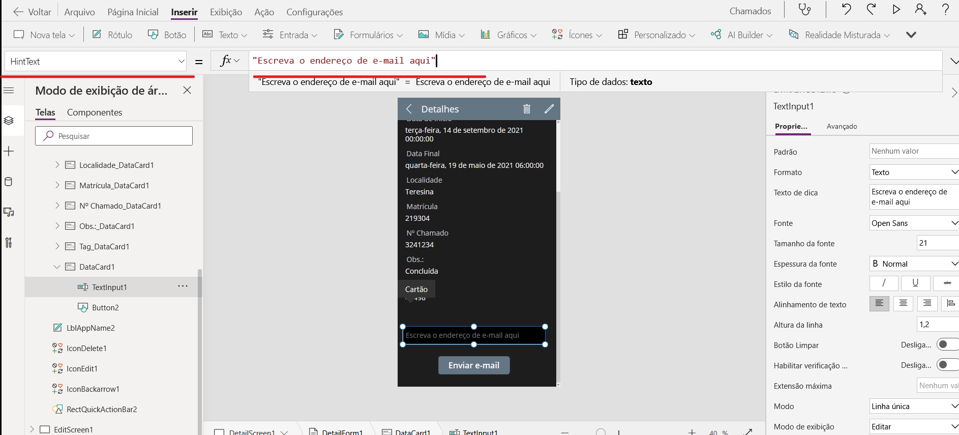 Vamos limpar o campo de default deixando apenas as aspas e iremos usar o campo de HintText para escrever a seguinte mensagem para o usuário: “Escreva o endereço de e-mail aqui”