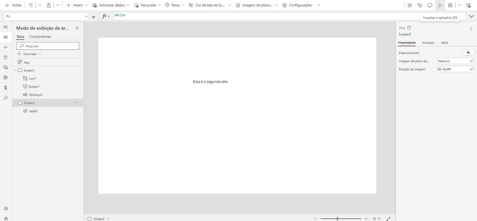 Na propriedade OnSelect do ícone colocaremos a seguinte fórmula: Navigate(Screen2)