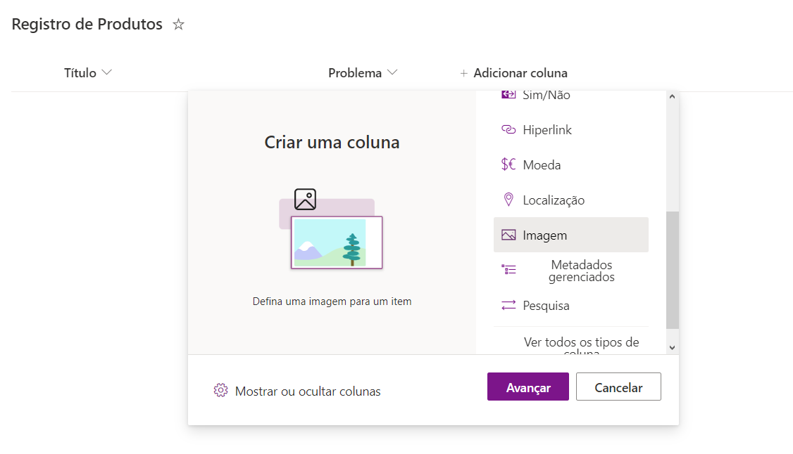 Agora iremos adicionar mais duas colunas dentro da lista e a primeira será do tipo Texto enquanto a segunda será do tipo Imagem