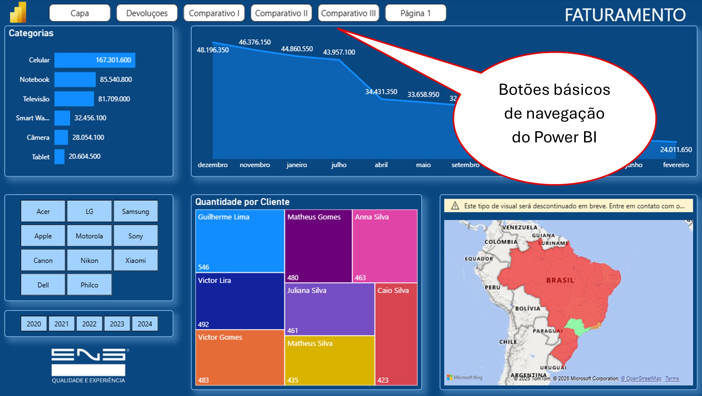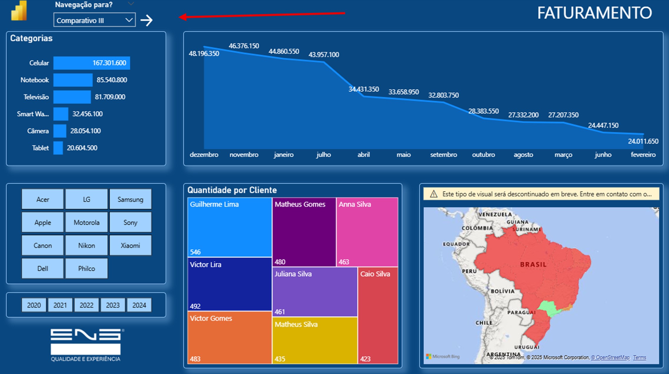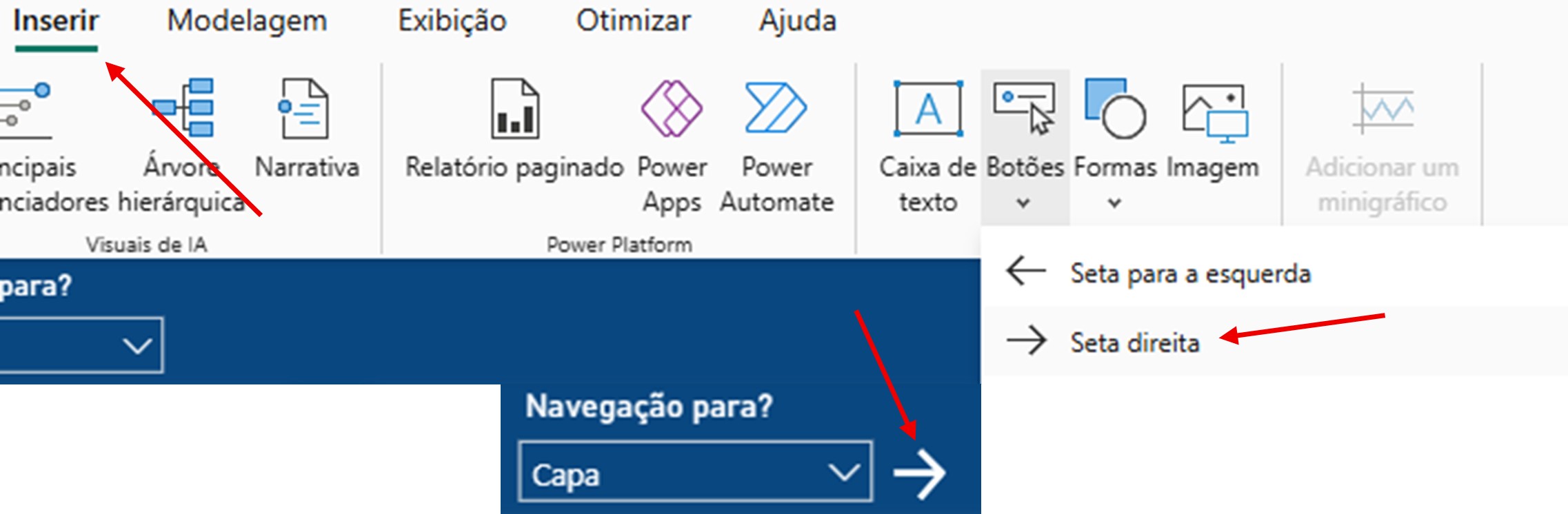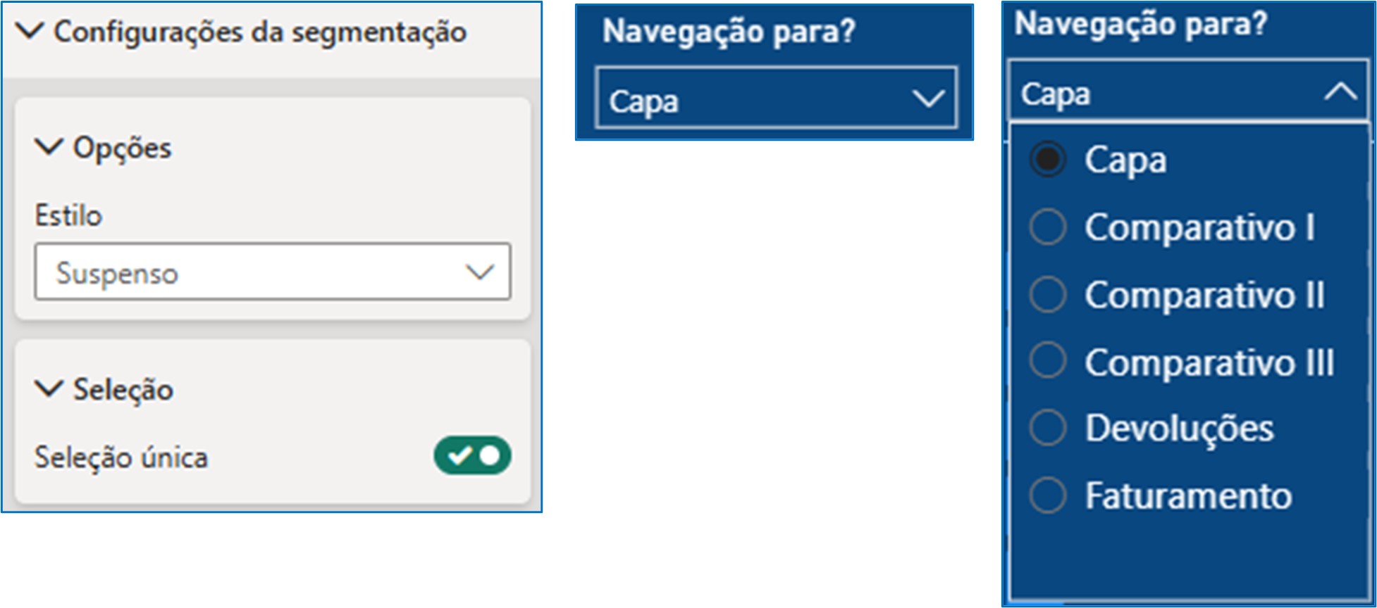 Existem diversas formas de navegação entre as diversas páginas de um projeto em Power BI e essa é bem interessante pois ocupa pouco espaço nos painéis e acho também elegante e bem discreto.