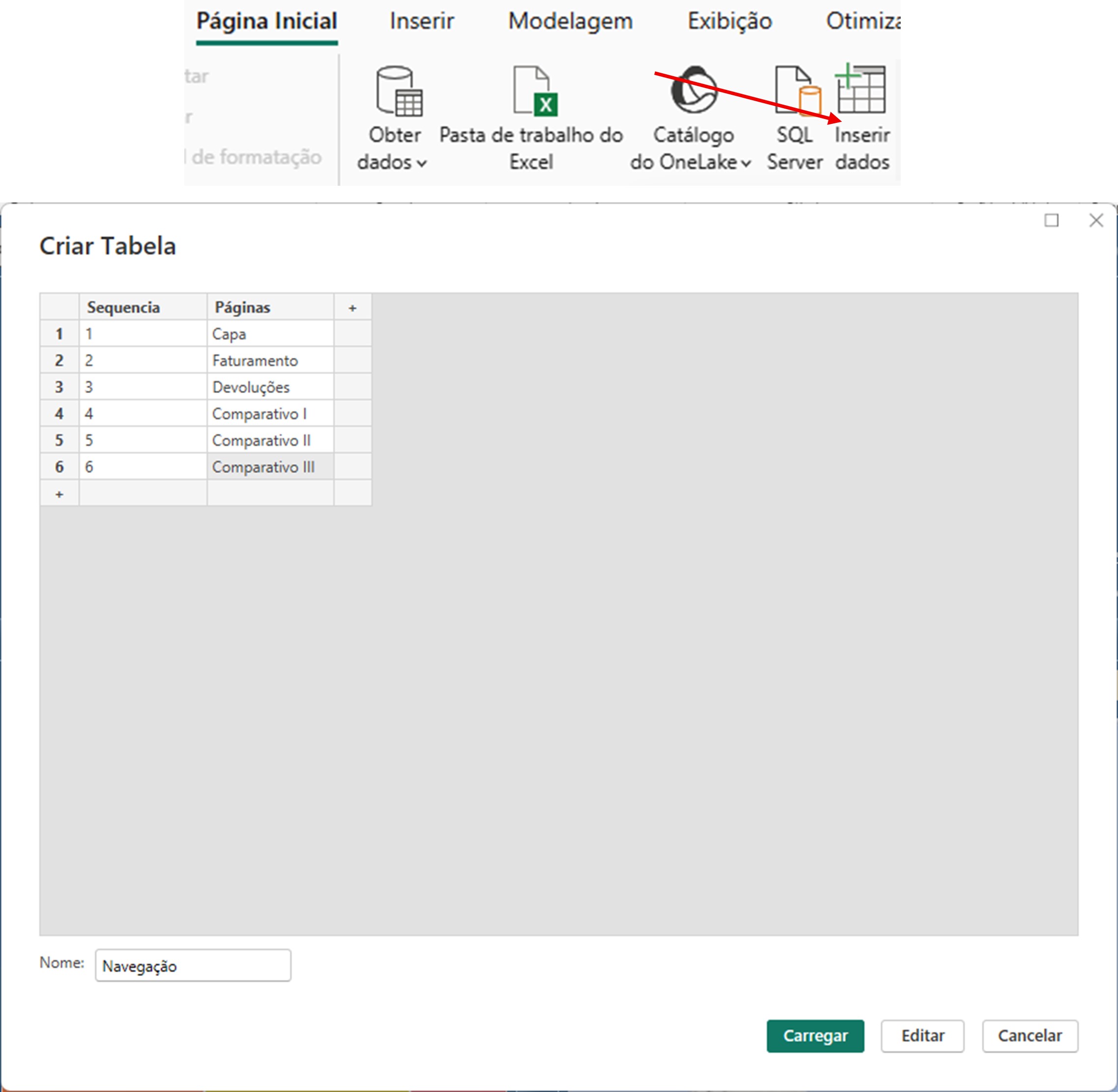 Criaremos a tabela com os nomes das páginas / relatórios do projeto e uma numeração sequencial, caso queiram alterar a ordem de apresentação das páginas.