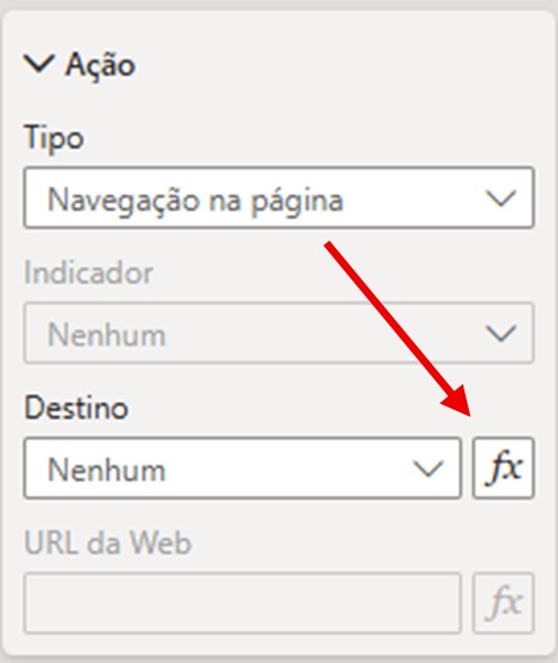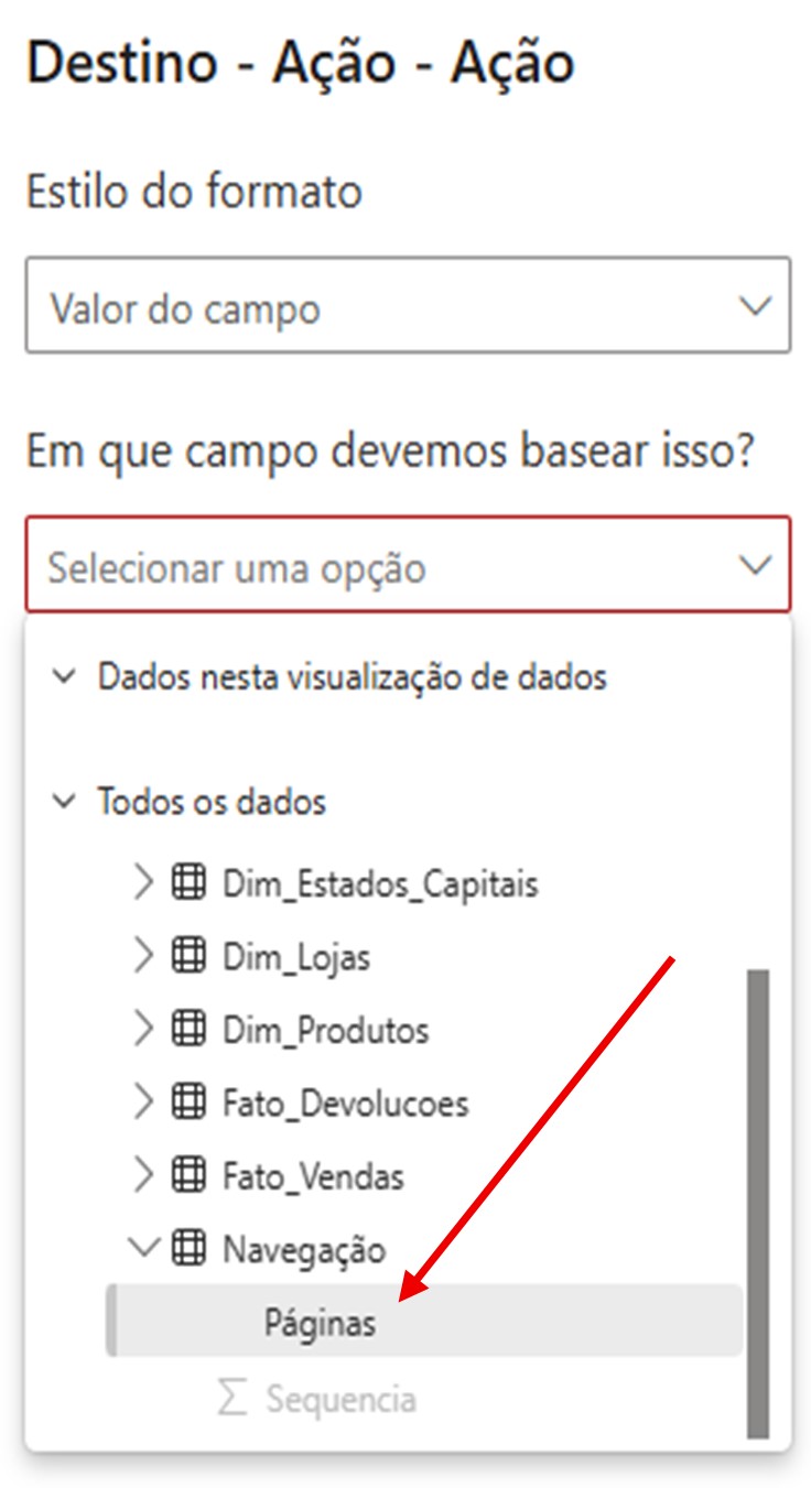 E é no destino que temos nossa etapa de “mestre” do Power BI, ou seja, ao invés de escolher uma página, entraremos na função conforme: